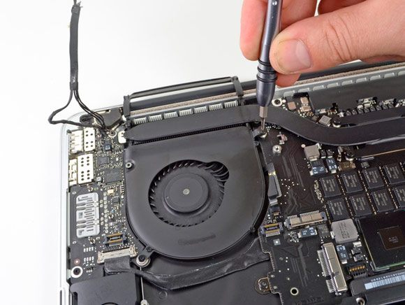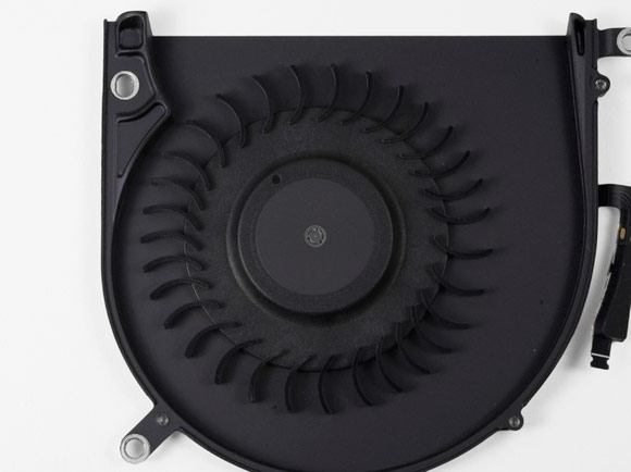 Кулер в тонком MacBook Pro — вещь совершенно не стандартная. Всё внимание на лопасти — они расположены ассиметрично, на разных расстояниях друг от друга. В видеоролике, посвящённом релизу нового лэптопа, Джони Айв поясняет, что при таком расположении кулер производит шум на разных звуковых частотах и, как следствие, общий уровень шума снижается. Очень любопытное решение.