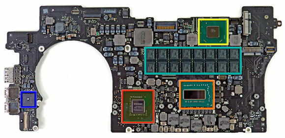 • Оранжевый — четырёхъядерный процессор Intel Core-i7 3720QM частотой 2,6 ГГц. Тут выясняется, что у iFixit топовая модель Pro, за 2 800 долларов;