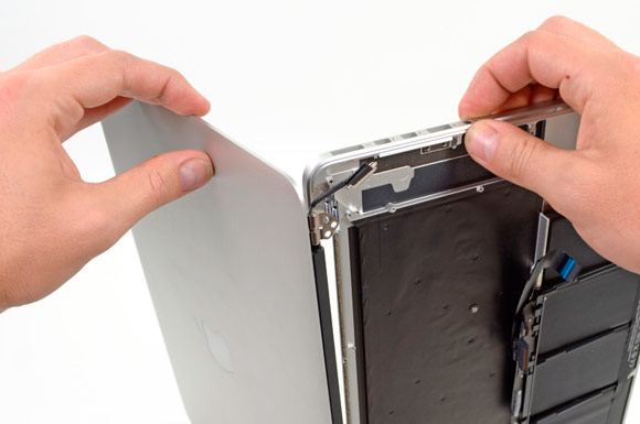 Теперь отсоединяем этот ваш Retina-дисплей от нижней части корпуса. Полюбуемся им в конце, вместе с остальными компонентами.