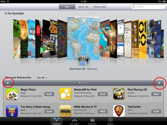 Компания Apple внесла одно небольшое, но очень полезное дополнение в интерфейс приложения AppStore для iPad, Данное дополнение позволяет перемещаться по магазину приложений с большим удобством и скоростью. Вы спросите, что же произошло? Дело в том, что “яблочники” наконец-то отказались от стрелок, которые использовались для пролистывания списка приложений и достались iPad “по наследству” от интерфейса AppStore на iPhone.